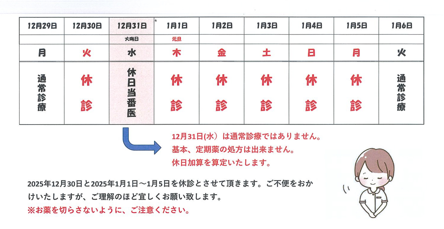 土曜午後、日曜、祝日、年末年始、臨時休診あり